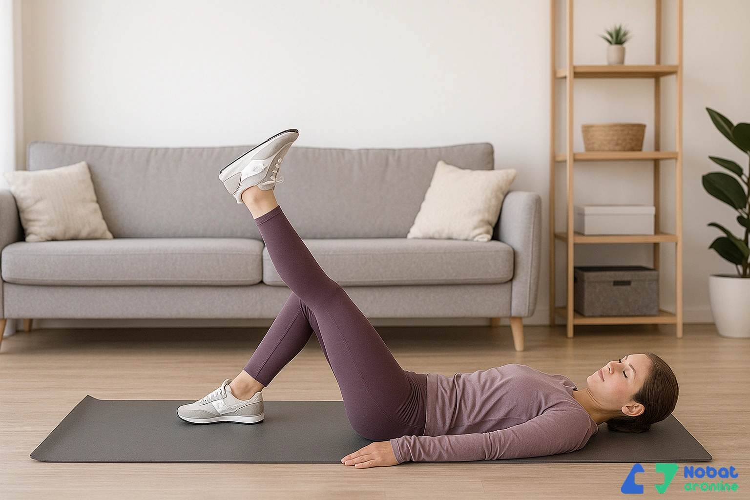 - به پشت روی زمین دراز بکشید و یک پا را خم کنید تا کف پا روی زمین قرار بگیرد.