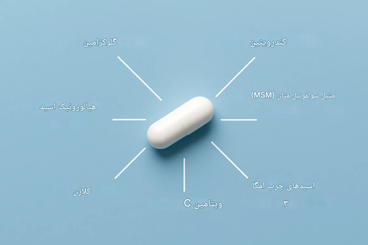 - MSM و امگا-۳: این مواد مثل ضدآتش یا ضد التهاب عمل میکنند؛ یعنی تورم و التهاب اطراف مفصل را کم میکنند و جلوی تخریب و ساییدگی بیشتر غضروف را میگیرند.