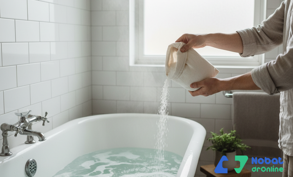 - مقداری نمک اپسوم یا نمک دریا را در آب ولرم (۳۷–۴۰ درجه سانتیگراد) حل کنید.